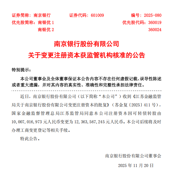 南京银行收到国家金融监督管理总局江苏监管局《关于南京银行股份有限公司变更注册资本的批复》(苏金复〔2025〕411号),同意公司因可转债转股调整注册资本。注册资本由原来的10,007,016,973元人民币,正式变更为12,363,567,245元人民币。